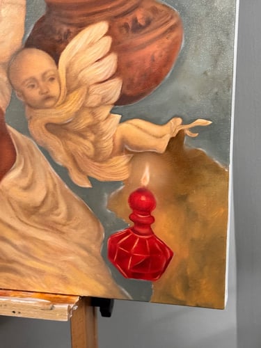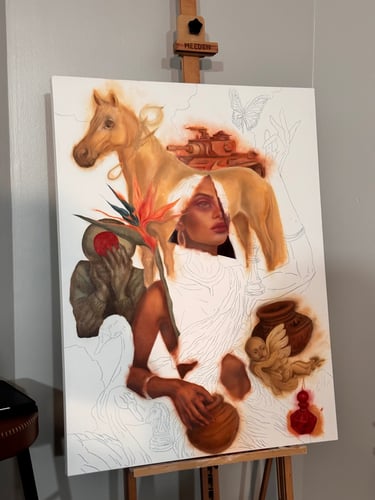 I sketch and build the piece digitally to understand the shape of it, then move to canvas, where oil paint lets the work breathe, shift, and settle into what it wants to be.