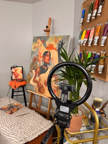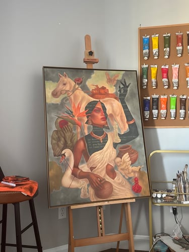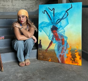 I’m a self-taught, multidisciplinary Pakistani-American based in Hartford, Connecticut, working primarily in oil and digital media. My work lives in the in-between: feminine divinity and quiet rage, softness and control, memory and myth.